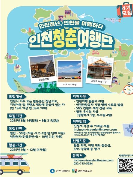 (도민방송=충남) 문성호기자 | 인천광역시와 인천관광공사는 인천 지역 청년들이 직접 여행을 체험하고 콘텐츠를 제작홍보하는 ‘인천청춘여행단 4기’참가자를 8월 14일부터 8월 31일까지 모집한다고 밝혔다.