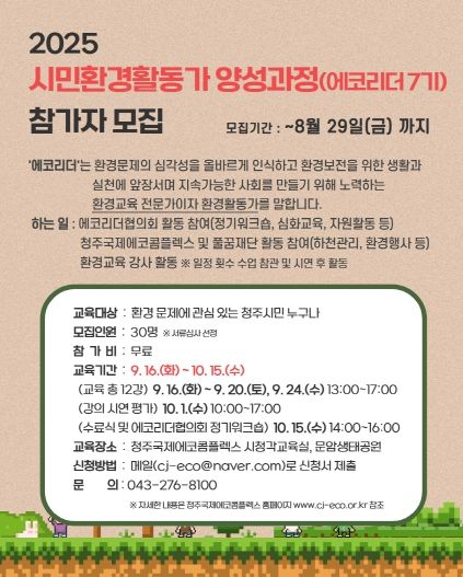 (도민방송 임경희기자) 청주시 환경교육센터인 청주국제에코콤플렉스에서는 오는 29일까지 2025시민환경활동가(에코리더 7기) 양성과정에 참여할 참가자를 모집한다.