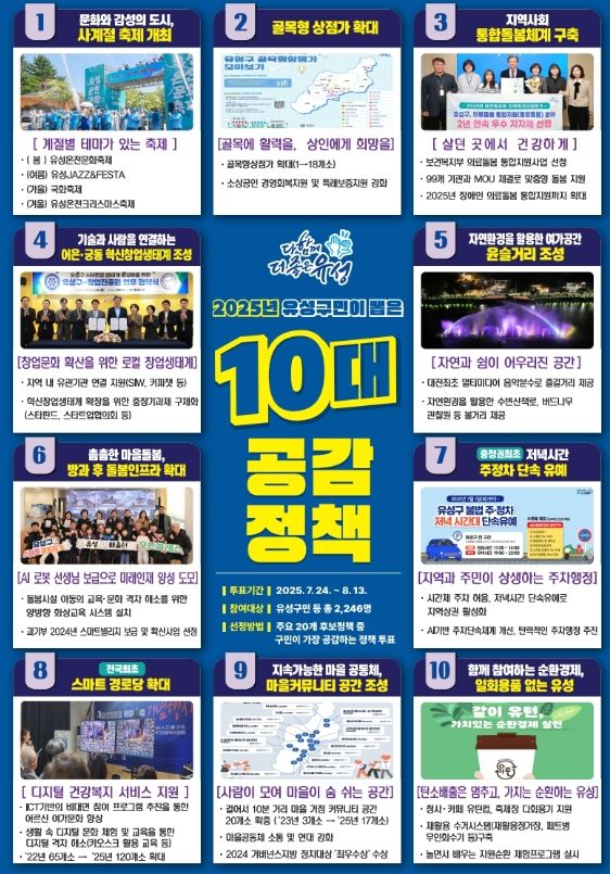 (도민방송 정연호기자) 대전 유성구는 민선 8기 3년 동안의 주요 성과를 구민과 공유하기 위해 ‘구민이 직접 체감한 10대 정책 온라인 투표’를 실시하고 그 결과를 20일 발표했다.
