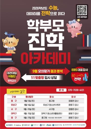 오전(09:20~12:30)에는 대전시교육청 대전대입지원단 소속 현직 교사가 수험생 개인 성적 데이터를 분석해 1:1로 지원 가능 대학과 학습 전략을 상담한다. 자치구별 25팀(팀당 30분)을 선착순 모집하며, 접수는 8월 25일 오후 2시부터 QR코드 또는 사전 예약 홈페이지를 통해 가능하다.
