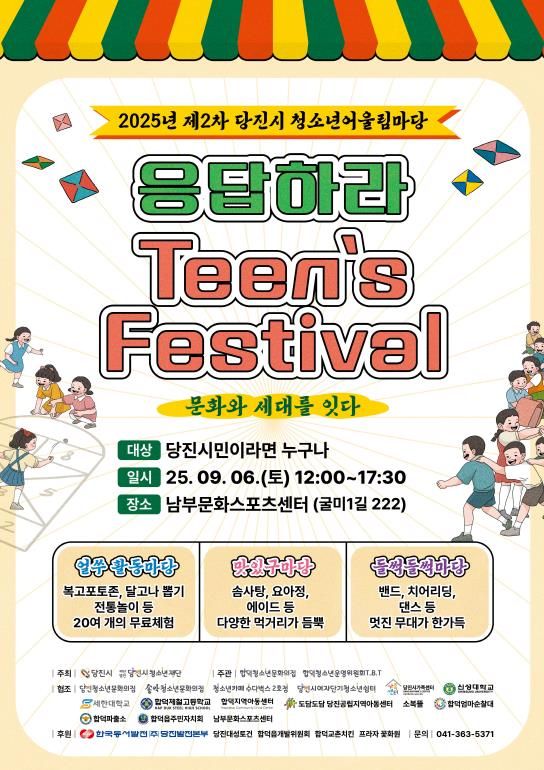 (도민방송=충남) 문성호기자 | 당진시, 당진시청소년재단이 주관하고 합덕청소년문화의집, 합덕청소년운영위원회 T.B.T가 주최하는 합덕 청소년어울림마당[응답하라 Teen’s Festival]이 오는 9월 6일 오후 12시 부터 5시 30분까지, 남부문화스포츠센터에서 개최된다.