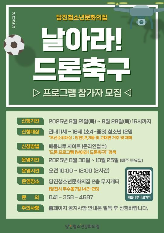 당진청소년문화의집은 드론 프로그램 [날아라! 드론축구] 외에도 다양한 청소년 참여 프로그램을 운영할 예정이다. 프로그램에 대한 자세한 내용은 홈페이지 공지사항의 안내문을 확인하면 된다.