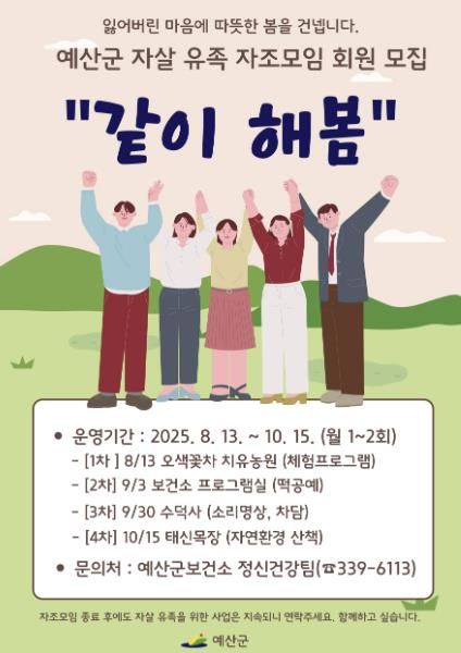 자조모임 ‘같이 해봄’은 군에 거주하는 자살 유족 누구나 참여할 수 있으며, 2∼4회차 모임은 9월부터 10월까지 월 1∼2회 운영될 예정이다.