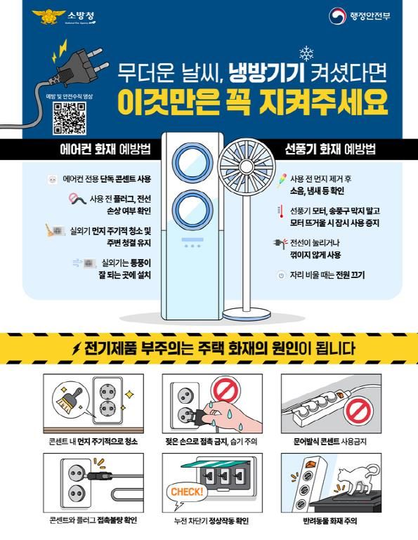 소방서에 따르면 최근 무더운 날씨로 냉방기기 사용량이 증가하면서 문어발식 콘센트 사용, 전기제품 과열 등으로 인한 화재가 빈번하게 발생하고 있다. 이에 따라 가정에서 반드시 지켜야 할 안전 수칙으로 ▲에어컨은 전용 단독 콘센트 사용 ▲사용 전 플러그·전선 손상 여부 확인 ▲실외기는 통풍이 잘되는 곳에 설치 ▲선풍기는 사용 전 먼지 제거 후 소음·냄새 점검 ▲자리 비움 시 전원 차단 등이 강조됐다.