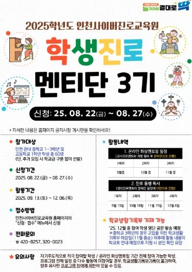 (도민방송=충남) 문성호기자 | 인천광역시교육청 인천사이버진로교육원에서는 8월 22일부터 ‘학생진로멘티단 3기’를 모집한다.