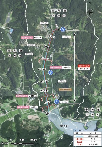 청동천 개선복구사업은 제방 및 호안 2.80km, 교량 재가설 6개소, 배수 시설물 15개소, 보 및 낙차공 재가설 11개소 등을 주요 내용으로 한다. 이는 단순한 기능 복원이 아닌 집중호우에도 안전한 하천 구조로 재정비하여 군민의 생명과 재산을 근본적으로 보호할 수 있는 기반 마련에 중점을 두고 있다.