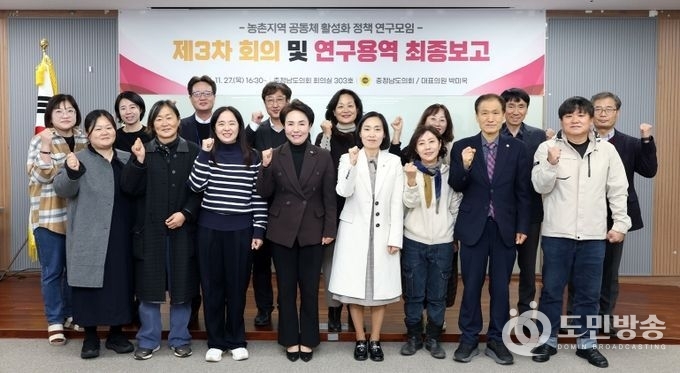 (도민방송 =충남) 문성호기자/ 충남도의회 ‘농촌지역 공동체 활성화 정책 연구모임’(대표 박미옥)은 지난 27일 도의회에서 제3차 회의 및 연구용역 최종보고회를 열고, ‘충남형 농촌 서비스 통합모델’ 구축 방향을 심도 있게 논의했다.