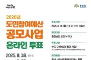 (도민방송=충남) 문성호기자 | 충남도는 오는 18일부터 27일까지 ‘2026년 도민참여예산 공모 제안사업’ 선정을 위한 온라인 투표를 진행한다고 14일 밝혔다. 투표는 도 온라인 소통 플랫폼 ‘충남서로이(e)음’에서 할 수 있고, 분야별 우선순위 사업을 5건씩 선택하면 된다. 투표 대상은 △도 정책사업 17건(53억원) △시군 주민 생활 밀착사업 27건(51억 7590만원)이다. 도는 도민투표결과(30%)와 28일부터 9월 1일까지 진행하는 도민참여예산위원 투표결과(70%)를 합산해 사업을 선정할 예정이다. 최종 선정된 사업은 내년도 본예산 편성에 반영되며, 선정 결과는 9월초 도 누리집과 충남서로이(e)음에서 확인할 수 있다. 도 관계자는 “도민참여예산은 도민이 사업 제안부터 예산 편성까지 참여하는 재정 민주주의의 중요한 과정”이라며 “꼭 필요한 사업이 선정될 수 있도록 도민분들의 적극적인 관심과 투표 참여를 부탁드린다”고 말했다. [뉴스출처 : 충청남도]