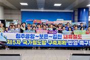 (도민방송 임경희기자) 충북 진천군이 충청권의 중추적 교통거점인 청주공항의 민간전용 활주로 건설과 이를 연계한 철도망 구축의 시급성과 당위성을 강조하고 나섰다. 송기섭 진천군수는 8일 청주국제공항 여객청사에서 열린 ‘청주공항 활주로 건설 및 관련 철도사업 촉구 결의대회’에 참석해 관련 사업의 조속한 추진을 강력히 촉구했다. 이번 행사에는 충북도와 청주시, 보은군을 비롯해 민관정위원회 위원, 관계 공무원, 지역 주민 등 40여 명이 참석했다. 현장에서는 청주국제공항 민간 활주로 신설과 함께 잠실 또는 동탄에서 청주공항을 연결하는 광역철도, 청주공항에서 보은, 김천으로 이어지는 내륙철도의 조기 추진을 촉구하는 결의와 구호 제창, 피켓 퍼포먼스, 홍보활동 등이 진행됐다. 송 군수는 이 자리에서 “청주공항 민간전용 활주로 건설이 반드시 국가계획에 반영돼야 하며, 이를 뒷받침할 특별법 제정을 통해 안정적인 법적·재정적 기반이 마련돼야 한다”고 밝혔다. 또한 “잠실 또는 동탄에서 청주공항을 연결하는 광역철도는 수도권과 중부내륙을 잇는 국가 종축 철도망의 핵심축으로, 청주공항과 연계해 조속히 추진돼