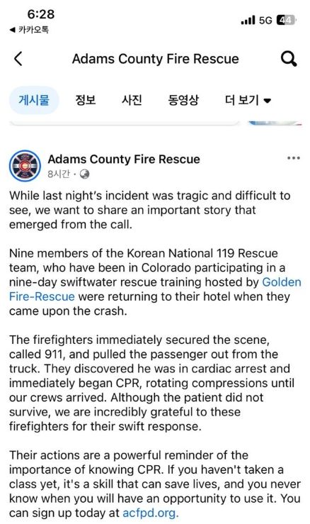 도민방송 문성호기자 | 미국 콜로라도주 아담스 소방서에서 SNS(소셜 미디어)를 통해 대한민국 소방에 감사를 전해왔다.