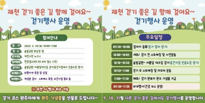 이번 행사는 걷기의 중요성을 알리고 건강한 생활습관 형성을 돕기 위해 기획됐으며, 제천시민 누구나 참여 가능하다. 당일 오전 9시 30분부터 현장 접수가 시작되며, 참가자에게는 참가 팔찌가 제공된다.