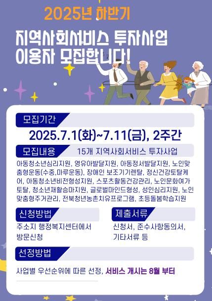 도민방송 정연호기자 | 군산시가 ‘2025년 하반기 지역사회서비스 투자사업’ 이용자를 오는 7월 1일부터 11일까지 2주간 모집한다.