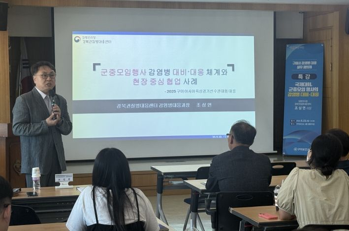 특히 질병관리청 경북권질병대응센터 조상연 과장은 ‘국제대회 및 군중모임 행사에서의 감염병 대비·대응’을 주제로 특강을 진행했다. 조 과장은 “대규모 인원이 한정된 공간에 집결하는 국제행사에서는 예방 단계부터 체계적인 대응이 무엇보다 중요하다”고 강조하며, 아시아육상대회 당시 구미보건소, 경북질병대응센터, 아시아육상추진단 간의 유기적 협조 사례를 성공 요인으로 짚었다.
