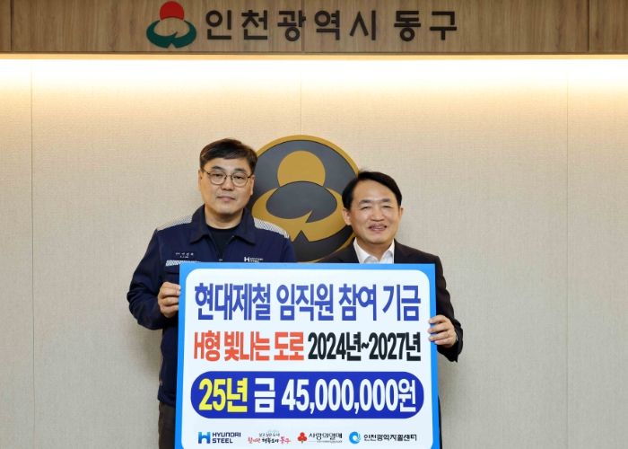 도민방송 정연호기자 | 인천 동구는 지난 23일 현대제철 인천공장이 ‘H형 빛나는 도로’ 사업 조성기금 4천500만원을 전달했다고 밝혔다.