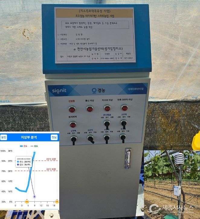 성거입장지소는 포도 노지스마트팜에서 수집된 온도, 습도, 토양수분 등 다양한 환경 데이터를 분석해 농업인들이 고품질 포도를 재배할 수 있도록 지역 맞춤형 재배 관리방안을 지도할 예정이다.