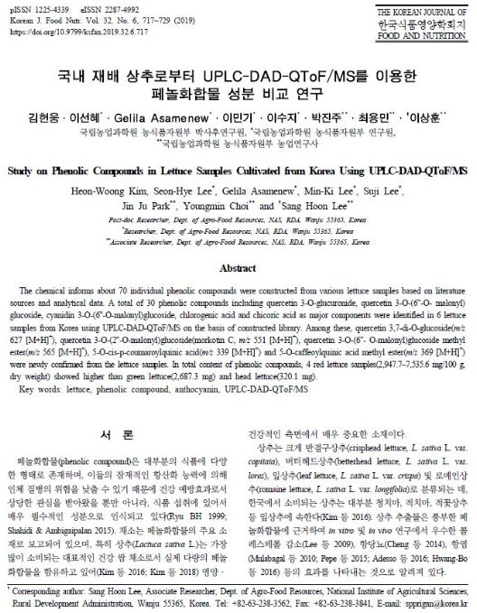 특히 이번 연구에서 퀘르세틴 다이글루코사이드(quercetin 3,7-di-O-glucoside), 클로로젠산 메틸에스터(chlorogenic acid methyl ester) 등 6종의 페놀화합물은 세계 최초로 상추에서 확인됐다.