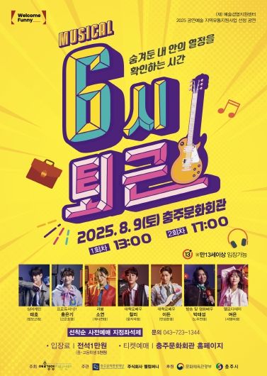 도민방송 문성호기자 | (재)충주문화관광재단은 직장인의 애환과 희망을 그린 라이브 밴드 뮤지컬 ‘6시 퇴근’을 오는 8월 9일 충주문화회관 공연장에서 선보인다.