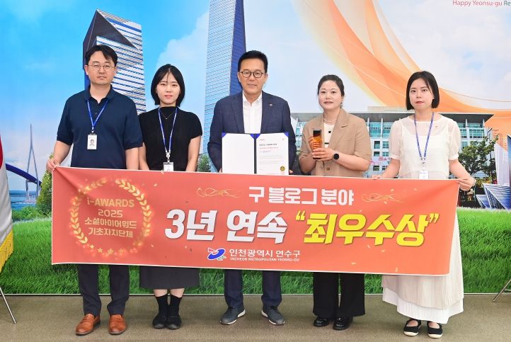 도민방송 문성호기자 | 연수구가 25일 (사)한국인터넷전문가협회가 주최한 ‘소셜아이어워드 2025’에서 기초자치단체 분야(구) 블로그 부문에서 3년 연속 최우수상을 수상하는 쾌거를 올렸다.