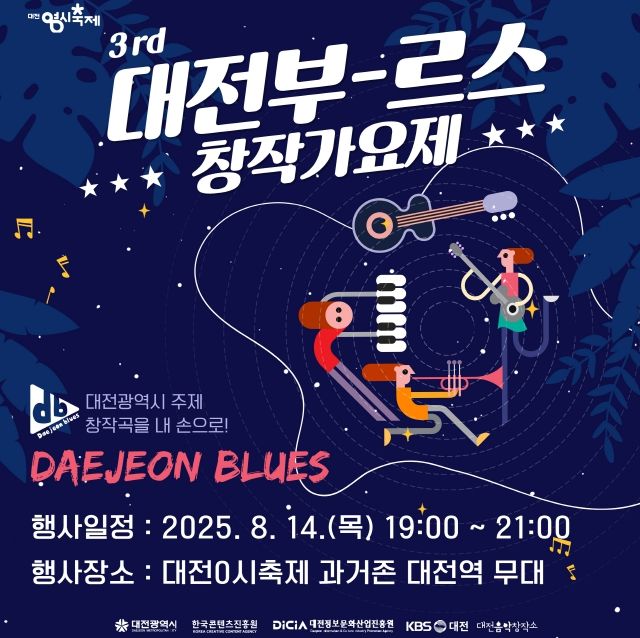 도민방송 정연호기자 | 대전의 정서를 담은 창작 음악 무대, ‘제3회 대전부르스 창작가요제’가 오는 8월 14일 오후 7시부터 9시까지 대전역 앞 야외무대에서 화려하게 열린다.