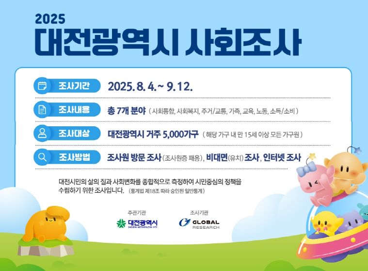 도민방송 정연호기자 | 대전시는 오는 8월 4일부터 9월 12일까지, 시민의 삶의 질과 의식구조 변화를 파악하기 위한 ‘2025년 대전사회조사’를 실시한다.