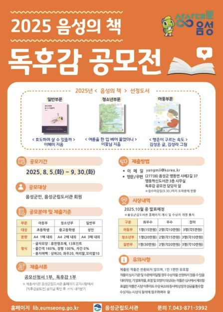 공모는 음성군민을 대상으로 초등부, 청소년부, 일반부 3개 부문으로 나눠 모집하며, 해당 부문의 선정 도서를 읽고 서식에 맞춰 작성한 독후감을 제출하면 된다.