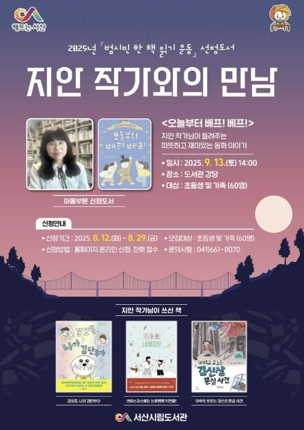 먼저, 오는 9월 13일에는 지안 작가를 서산시립도서관 강당에 초청해 ‘작가와의 만남’을 추진하며, 8월 12일부터 29일까지 참여자를 모집한다.