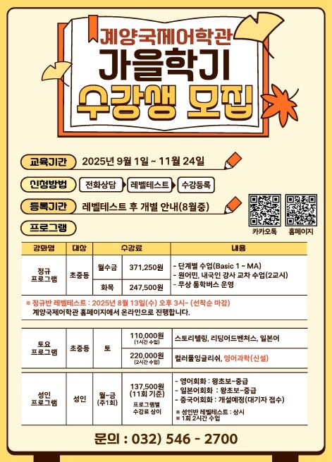 (도민방송=충남) 문성호기자 | 인천 계양국제어학관이 오는 9월 1일부터 시작되는 2025년 가을학기 프로그램 수강생을 모집한다.