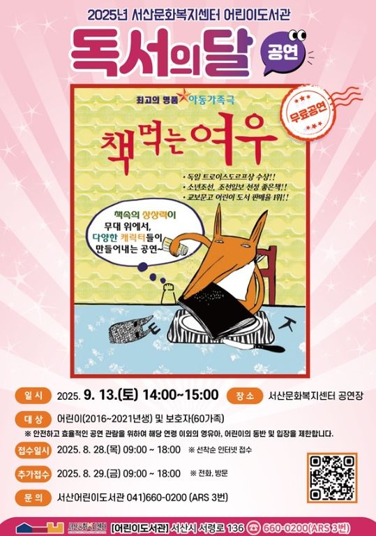 (도민방송=충남) 문성호기자 | 서산문화복지센터 어린이도서관은 9월 독서의 달을 맞아 어린이뮤지컬 ‘책 먹는 여우’ 공연을 9월 13일 토요일 14시부터 15시까지 서산문화복지센터 공연장에서 무료로 진행할 예정이라고 밝혔다.