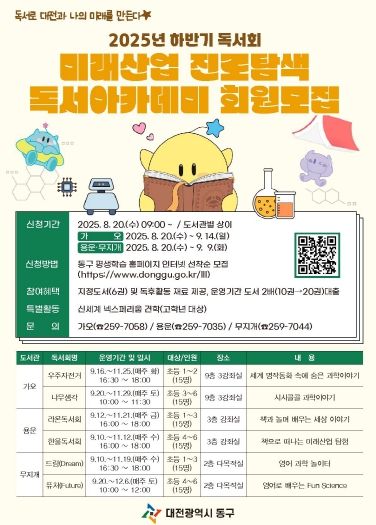 (도민방송 정연호기자) 대전 동구는 이달 20일부터 관내 공공도서관(가오‧용운‧무지개) 3곳에서 ‘2025년 하반기 독서회 미래산업 진로탐색 독서아카데미’ 회원을 모집한다고 19일 밝혔다.
