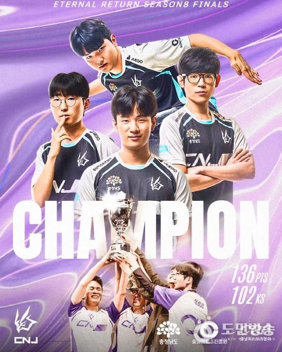 (도민방송 =충남) 정연호기자/ 충청남도를 대표하는 이스포츠 게임단 ‘CNJ Esports가 지난 12일 대전 드림 아레나에서 열린 이터널 리턴 마스터즈 시즌8 파이널에서 우승을 차지했다고 밝혔다.