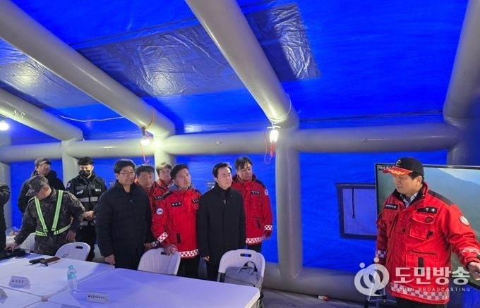 (도민방송 =충남) 문성호기자/ 김태흠 충남도지사는 22일 예산군 대술면 산불 현장 인근에 설치된 산불현장통합지휘본부를 찾아 진화 상황을 점검했다.