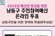 도민방송 문성호기자 | 인천시 남동구는 주민참여예산사업 우선순위 선정을 위한 온라인 투표를 8월 18일까지 실시한다고 1일 밝혔다. 남동구 온라인 주민투표는 주민참여예산 사업의 대표성을 확보하고 재정 운영의 투명성을 강화하기 위하여 2020년도에 도입되어 여섯 번째 시행하고 있다. 남동구민이면 누구나 온라인을 통해 참여할 수 있으며, 주민참여예산위원회 심의를 거친 19개 사업 중 3개 이내의 사업에 투표할 수 있다. 자세한 내용은 남동구청 누리집(홈페이지) 새소식 게시판에서 확인할 수 있다. 투표 결과는 남동구의 예산안 편성에 참고 자료로 활용되며, 2026년 예산 반영 여부는 12월 말에 남동구 의회의 예산안 의결 후 공개될 예정이다. 박종효 구청장은 “주민참여예산 투표는 구민이 직접 정책 결정에 참여하는 소중한 기회”라며 “주민투표의 대표성을 확보할 수 있도록 많은 구민 여러분의 적극적인 참여를 기대한다”라고 말했다. [뉴스출처 : 인천시 남동구]