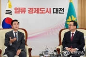 (도민방송 =충남) 문성호기자/ 김태흠 충남도지사가 장동혁 국민의힘 대표에게 ‘대전충남특별시 설치 및 경제과학수도 조성을 위한 특별법’ 원안 통과 지원을 요청했다. 김 지사는 14일 도청 접견실에서 장 대표를 만나 대전·충남 행정통합 관련 정책 협의를 진행했다. 이 자리에서 김 지사는 “대전·충남이 행정통합을 통해 광역으로 가야 규모 있는 행정이 가능하고, 수도권 일극 체제를 극복할 수 있다”고 강조했다. 이어 전국적으로 확산되고 있는 행정통합을 언급하며 “특별법안 257개 특례 조항은 재정 이양은 물론, 국가 사무 중 금강유역환경청과 고용노동관리, 농지 전용 등 다양한 권한 이양을 담고 있다”고 설명했다. 그러면서 김 지사는 “행정통합 추진 과정 속에서 이 같은 권한 이양 내용이 특별법안에 제대로 들어가야 한다”며 당 차원의 지원을 요청했다. 김 지사는 이와 함께 “충남에서 처음 시작하고 특별법안을 내놓은 만큼, 완벽하게 준비하지 않으면 역사의 죄인이 된다는 생각으로, 행정통합에 대한 무거운 책임감을 갖고 있다”고 덧붙이며, 중앙정부 권한 이양 등에 대한 대통령과 국회의 결단 필요성도 강조했다. 이에 대해 장 대표는 대전·충남 행정통합이 실질적인 지방분권을